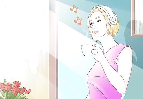 Awaken your senses. Does your routine involve lurching awake to a blaring alarm clock, jolting yourself into consciousness by dunking your face in a sink full of cold water, and scalding your throat by chugging down some coffee? If so, trying to engage each of your senses in a more pleasant, uplifting manner may help set a better tone for your new day. Natural sunlight signals the body to transition from sleeping to waking modes, so try to start each day by opening the shades. Better yet, open up the window or go outside. Breathe in the fresh air, listen to the birds chirping, and welcome the new day (if you are lucky enough to have that as your outdoor environment). Filling your room with warm, welcoming colors like reds and blues, having the color and fragrance of fresh flowers at the ready, and cueing up some uplifting music can all help engage your senses in a positive manner first thing in the morning.