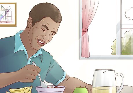 Eat a healthy breakfast. Your mother always said it was the most important meal of the day, and your food choices in the morning can indeed shape your eating habits (and how you feel) throughout the day. A good breakfast gives you more energy and focus, as opposed to when your stomach feels like an empty pit or is stuffed to the gills with unhealthy junk. Smart breakfast choices can include Greek yogurt with fresh fruit and flax seeds, oatmeal with dried fruit, or a vegetable omelet, among many others. Good, nutritious, quick breakfast recipes can be found easily online. Some people advocate for eating the same healthy breakfast (like that veggie omelet) every day, which cuts down on the time spent thinking about what to have for breakfast and then making it. If the notion of having the same breakfast every morning can’t pass muster with you, cycling through several healthy options each day may be a beneficial compromise.