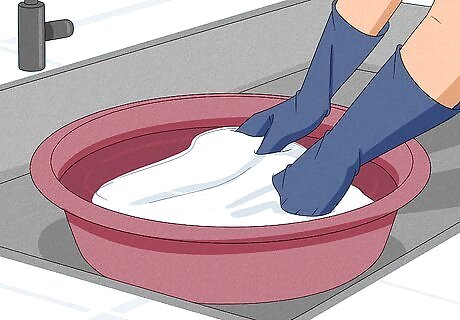 Submerge your clothes in the bleach mixture. Push the clothing down a bit to make sure that it is thoroughly saturated. You can also slowly swirl the clothes around a bit with your gloved hand, if you like. Leave the clothes to soak for at least 15 minutes. Do not soak your unprotected hands in the bleach mixture while handling the clothes. Instead, wear solid, well-fitting cleaning gloves to protect your skin.