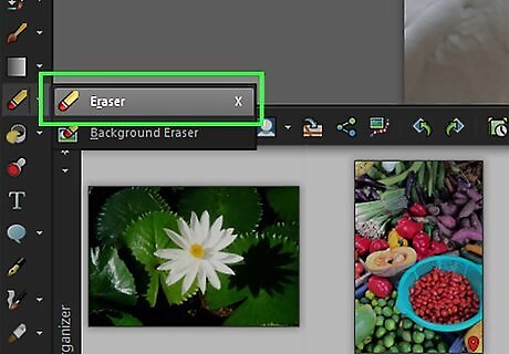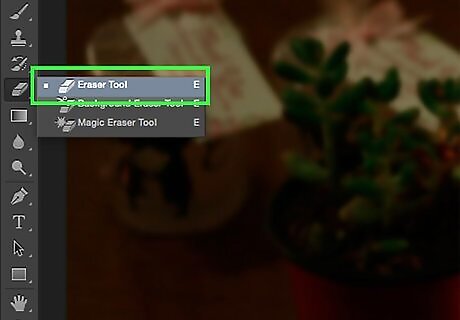 Erase your subject(s) back into focus. Since the original layer is still intact beneath the blurred one, using the eraser tool on your top layer will expose the clear image underneath. Select the Eraser tool from the toolbar to the left. Adjust the eraser size as you go. For larger swaths, use a large eraser; for details and edges, use a smaller, more precise eraser. Adjust the eraser opacity as you go. For large, interior areas, use a high opacity to erase as thoroughly as possible; for edges, lower the opacity to create a softer, subtle effect. Running a low-opacity eraser over the same place multiple times will have a cumulative effect, so err on the side of low opacity where necessary.