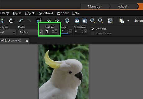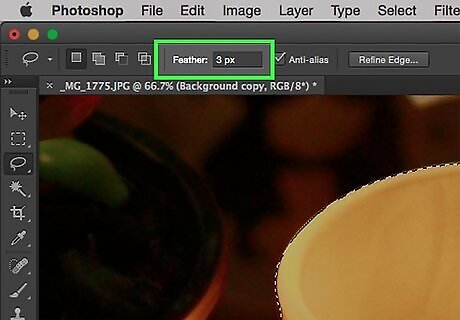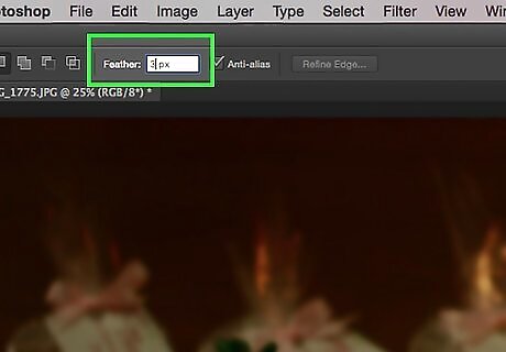 Use the Blur Tool to soften the edges of your in-focus foreground. This should be on the same toolbar as the Lasso Tool. Set the blur tool's strength to somewhere around 33%. Set your brush size to a comfortable level such as a radius of 5 to 15 pixels. If you don't see a brush size option, select Brushes from the Window menu in Photoshop. Use the blur tool to touch up the outside edge of your foreground, especially where the image seems pixelated. This will help to create a sense of transition between your foreground and background that is easy on the eyes.