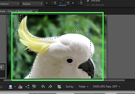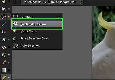 Select the Freehand Selection tool (which looks like a lasso) from your tool palette. You’ll use this to select the image(s) in the photo that you want to distinguish from your blurred background. Choose the selection type based on what is most suitable for your particular image. Ex.: If the image you want to emphasize has very straight edges, change the selection type to Point-to-Point, which will create straight lines between the points you click. If there’s a sharp, clear edge between the background and the image you want to emphasize, change the selection type to Smart Edge, which will find the edge for you.