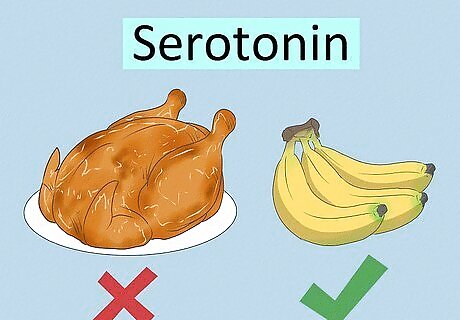 Understand the serotonin/food myths. Unfortunately, there are a lot of myths surrounding food and increased levels of serotonin. These myths include: Foods rich in tryptophan automatically boost serotonin. This is false. Most foods that contain tryptophan, an amino acid, compete with other amino acids to be absorbed by the body's transport system. Eating a lot of turkey, which is rich in tryptophan, will not automatically give you more serotonin. Eating a lot of banana will automatically boost serotonin. Bananas do contain serotonin. That serotonin, however, is unable to cross the blood-brain barrier and be absorbed by humans.