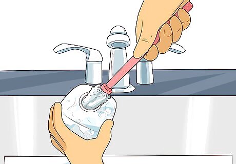 Clean the calf bottle and nipple before first use and after every feeding. Whether you are using a newly purchased calf bottle or one that was previously used to feed another calf, you'll need to thoroughly clean the bottle before using. The bottle will need to be washed again after every feeding. To prepare for washing, remove the nipple from the bottle. Rinse the bottle and nipple to remove any surface dirt and milk or formula. Wash the bottle and nipple with hot water and your preferred soap or cleaning detergent. Use a brush to thoroughly wash the inside of the bottle. When washing the nipple, check for tears or cracks. If you notice such flaws, discard the nipple and use a new one. Cracked or torn nipples are hiding places for bacteria that can make your calf sick. After washing the bottle and nipple, thoroughly rinse with warm water. Allow the bottle and nipple to fully air dry before the next use. Try setting the bottle upside down on a rack so that any remaining water can fully drain off. Keep several bottles and nipples on hand so that there is always a clean, dry bottle ready to go before each feeding.