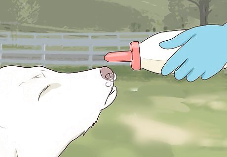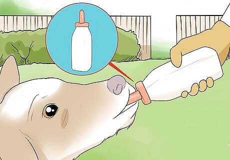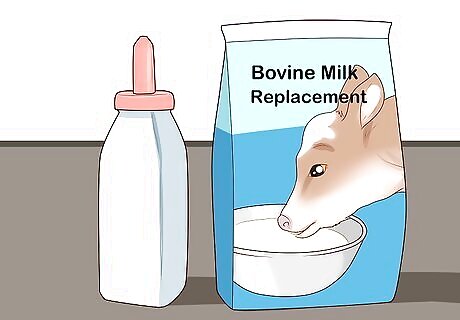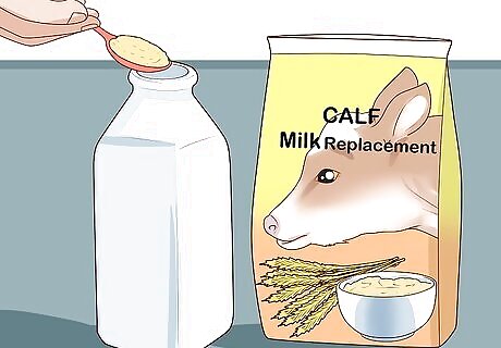 Prepare a bottle of bovine milk replacement formula (if not using milk). The formula is made by mixing a scoop of dry formula with warm water. Refer to the formula package directions to determine the exact amounts of dry formula and water to mix together for one quart of liquid. Instructions might vary slightly between formula types. Keep in mind that calves under 3 weeks shouldn't have non-milk proteins. Add the appropriate amounts of dry formula and water to the bottle, put the nipple on the bottle, and shake to mix the contents together. Give your calf one quart of formula or milk for the first few weeks, after which time you will up the amount to two quarts. If you have plenty of cow's milk available (preferably unpasteurized raw milk) from a milk cow, then you can use that in the calf's bottle rather than formula. Just fill up the bottle with milk and feed the calf. Alternatives to commercial formula include dried whey protein concentrate, dried skim milk, soy protein concentrate, and modified wheat protein.