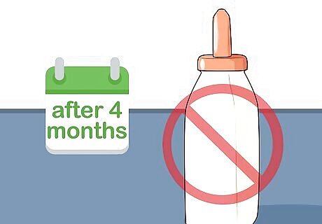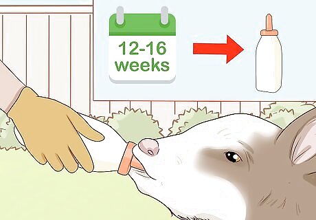 Wean from the bottle completely by four months. At four months of age, the calf should be getting enough nutrition from the grains and alfalfa or pasture grass to no longer need bottles of formula or milk. You can stop giving the calf the bottle at this point. Be sure to provide enough grains (ground feed) daily based on the calf's weight and allow it out to pasture daily.