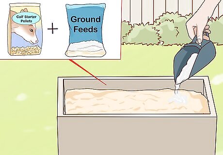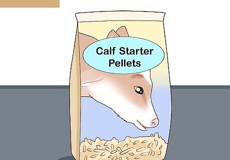 Give the calf starter pellets after two weeks. This will help your calf get used to eating solid foods. The pellets can be purchased from a feed store. Continue providing pellets for the calf until it is eight weeks old. Fresh water and alfalfa should still be provided, as well as the salt lick. If the calf is reluctant to eat the pellets, try putting a few in its mouth right after bottle feeding.