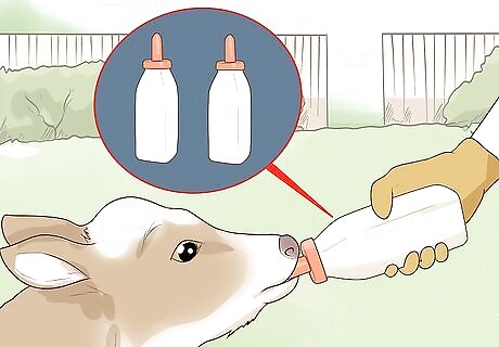 Feed your calf one quart of milk or formula in the bottle 2-3 times per day for the first two weeks. Some calf owners bottle feed their calves just twice a day; others prefer to do so three times daily. Whether you feed your calf two or three times a day is your choice and can depend on your calf's appetite.