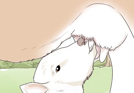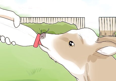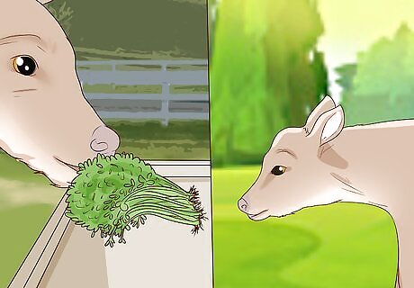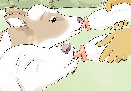 Raise two bottle fed calves together, if possible. Cows are herd animals and do best when not alone. If you only have one calf and no other cows, sheep, goats, and even horses can make good companions for your calf. The calf can graze with the other animals when it is old enough to eat grass and solids. If raising two calves simultaneously, you can easily feed them both at the same time by holding one bottle in each hand.