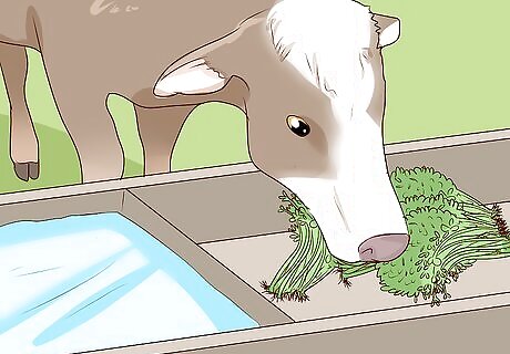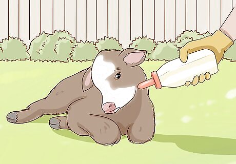Introduce alfalfa and fresh water after the first week of life. The calf might not show much interest in anything but the bottle at first, but it is important to keep fresh water and alfalfa nearby. The calf will soon become curious and begin nibbling at the alfalfa and sipping the water. A salt or mineral lick should also be provided. You can find these easily at feed stores.
