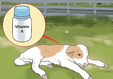Provide vitamin A supplements if your calf shows signs of a deficiency. Younger calves are most susceptible to vitamin A deficiency because they have not yet built up a reserve supply of vitamins in their bodies. If your calf has a loss of appetite, rapid breathing, joint swelling, and even weight loss, it might be deficient in vitamin A. Consult a vet who treats cows and calves before starting any treatment. To correct a vitamin A deficiency, administer a shot of vitamin A or add powdered vitamins to its bottle. Grains that have gotten wet or moldy lose some of their vitamin content and might not offer enough nutrition. Replace with fresh grains immediately. Calves that are deficient in one mineral like vitamin D are often deficient in others, like vitamin E, copper, manganese, selenium, or zinc.