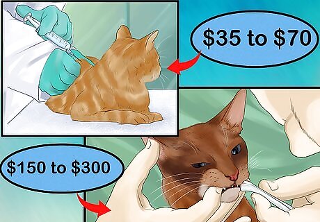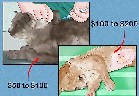 Figure out what regular medical care will cost. After your cat’s initial vet visit and vaccination, you’ll also have to pay for yearly exams, vaccinations, and more. Without regular care, your cat won’t be able to have the quality of life you want it to have. Some medical costs include: Annual vaccinations. These could cost between $35 and $70. Teeth cleaning. This may cost between $150 and $300. Examinations. You’ll have to pay exam fees whenever you go to the vet. You should factor in 2 to 3 exams per year, at somewhere between $35 and $70.