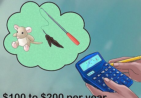 Build in a budget for toys. Your cat will quickly outgrow – or destroy – their initial toys. Thus, you’ll have to continue to buy toys throughout your cat’s life. This is important, as cats need constant stimulation to be properly socialized and fulfilled. Buy toys they can play with on their own. For example, invest in some stuffed mice or similar toys. Purchase a few toys you can play with them. A cat fishing pole, with a stuffed mouse or a feather on the end of it will likely entertain you and your friend for hours. Your toy budget is somewhat discretionary. While you should make sure your cat always has toys, you can shop around for toys and spend as little or as much as you want.