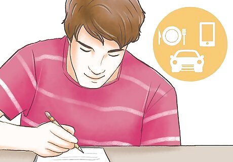 List necessary expenses. To figure out where you can cut costs, look at your list of expenses again. Circle everything you don’t have a choice about spending money on. For instance, a car payment is a necessary expense if you drive to school or work. But new clothes are not a necessary expense, since you could continue wearing your current wardrobe. Other necessary expenses might be gas or insurance for your car, school supplies, toiletries, or a cell phone. Other expenses that aren’t necessary are eating out, going to movies, buying video games, or buying extra pairs of shoes.
