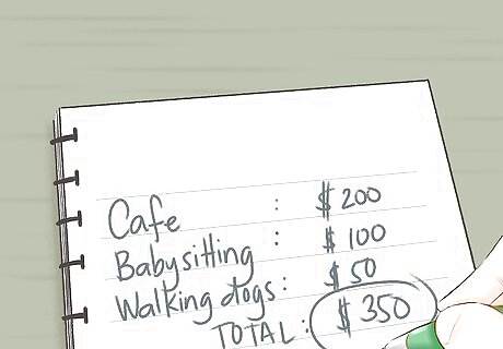 Add up how much money you earn. Make a list of the things you do each month that bring in money. Do you get an allowance? Do you babysit? Do you mow lawns in your neighborhood? Include anything that you do regularly. Then add up the amounts of money you receive for these things. For example, if each month you earn about $200 working at a cafe, $100 babysitting, and $50 walking dogs, then your monthly income is $350. If these amounts vary from month to month, add up your income from the last six months, and then divide by six to get an average.