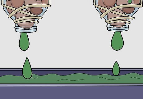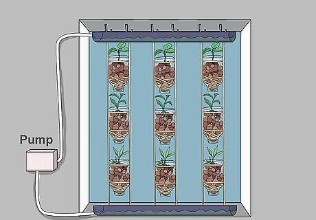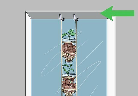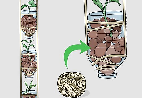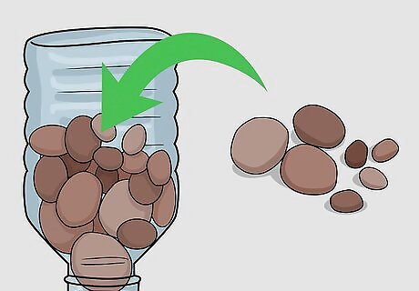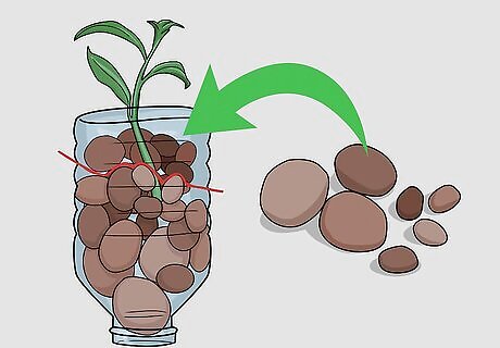 Hold each bottle inverted (neck down) and place a few clay fired pebbles into the bottles through the sliced-off bottom. If the pellets have a tendency to fall out of the bottle's mouth, place a piece of cloth in the neck and then add the pebbles. These pebbles act as soil, holding enough water for the roots and also allowing for air to pass.