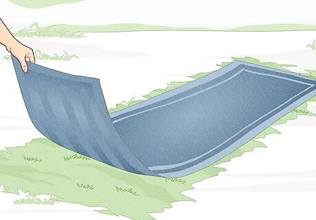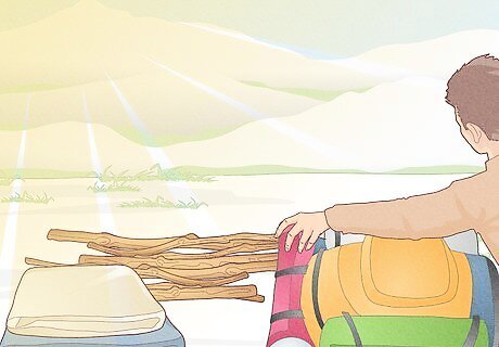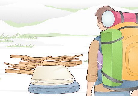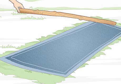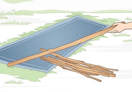 Pad the ground. After clearing this spot of any wet debris it must be padded with materials that are as dry as possible. Pine boughs can be 'slapped' against a tree trunk to knock water, ice, and snow off to dry the materials. Any man made materials you have access to can be used as well: Floor mats from a car, seat cushions, plastic grocery sacks filled with leaves... Anything that will distance you from the ground and keep you dry. The ground steals heat rapidly and water pools in low spots so this step is critical.