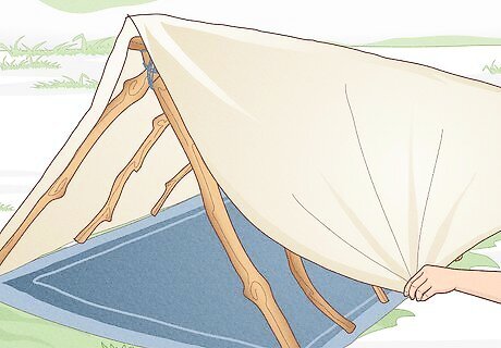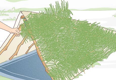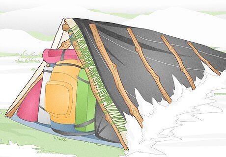 Add more cover. Crush flat standing weeds and lay them over the branches as well. The goal is to evenly heap water proofing natural materials over the frame not only to keep you dry but to insulate you as well. A plastic tarp, split open plastic trash bags, or rubber floor mats could be draped over the frame and if done properly would keep you dry but would provide little to no insulation. The idea is to block all light from being seen while in the shelter. Pinpoints of light mean air (and heat) can easily escape from the inside. Covering the shelter with as much insulating material as possible is limited by the strength of your spine pole and of course the amount of available materials. Even in an open field you can gather bunches of field grasses and make a 'pile' shelter, so covering your 'A' frame should not prove too difficult. Weigh down any materials you cover the frame with to keep them from blowing away in the wind. Mud, branches, and even snow will hold the materials down. Also, snow is a natural insulator.