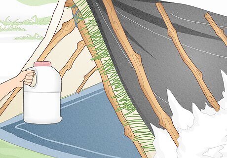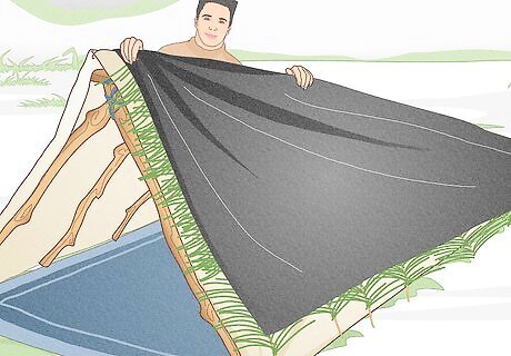 Find materials to cover the frame. Any water proofing materials you have will be put to good use in this step but you can still do it without any man made materials.