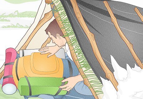 Close off the shelter. Once the survivor and up to one other guest back into the shelter through the triangle opening at its mouth, they will need to close off the opening. Backpacks, a trash bag full of leaves, or a small frame of sticks tied together and strung with as much materials as possible can be used. Feel free to 'stuff' the interior of the shelter with dry grasses, leaves, or other materials (rugs, blankets, pillows). The extra padding will help keep you warm as well.