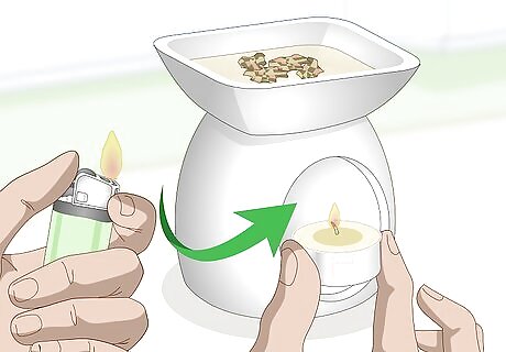 Light a tea light and put it into the oil warmer. You can put the tea light into the oil warmer first, then light it with a candle lighter instead--the long, slender pole will fit into the candle warmer. If you only have matches or regular lighters, light the tea light first, then carefully put it into the oil warmer. Don't use a votive candle. They are too tall. You need to use a tea light. Use an plain, unfragranced tea light, otherwise the aroma will mix with that of the incense.