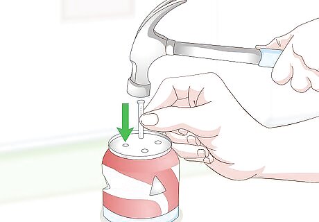 Poke some holes into the bottom of the can. Flip the can over so that you can see the bowl-shaped bottom. Make sure that it is on a stable surface, then use a nail and hammer to punch a hole in the middle of the bowl-shaped bottom. You can add 3 to 4 more holes around the first hole. Make sure that they can all fit under a tea light.