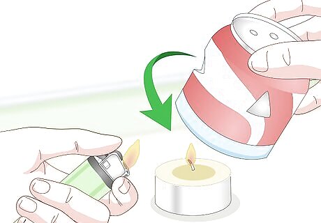 Light a tea light and set the can over it. Set a tea light on a heat-safe surface that's big enough to hold the can as well. Set the can over it so that the bowl-shaped bottom is facing up. Don't use a votive candle; it is too tall. Avoid using fragranced candles, or you won't smell the incense. The surface must be heat-safe, such as a ceramic plate. Do not use this on a wooden table or a tablecloth.