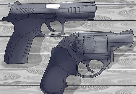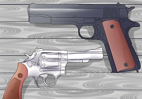 Decide between a semi-automatic pistol and a revolver. Both kinds of handguns are iconic pistols in Hollywood. Cowboy shooter like Dirty Harry or a semi-auto like James Bond? Whether you want to spin the chamber or rack the slide, you can get a reliable gun. Semi-auto pistols are magazine-loaded, the chamber fed by pre-loaded magazines that hold between 9 and 12 shots. To fire semi-automatic pistols, the slide on top of the gun needs to be pulled back to advance a bullet into the chamber and depress the hammer. Revolvers hold between 5 and 9 shells and advance by rotating in a clockwise motion, advancing through the chambers. To remove the spent shells, the revolving chamber is rotated to the side and the shells are emptied manually. The hammer is likewise pulled back manually on a revolver.