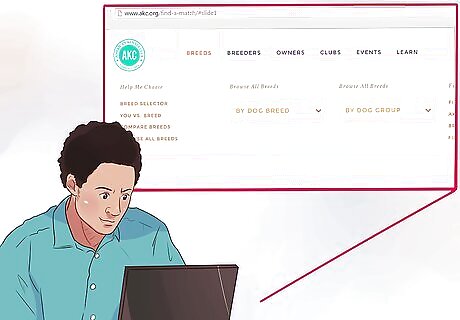 Decide what breed is a good fit for you. Research breeds with characteristics (e.g., small dog, calm temperament, etc.) that make them a good fit for your life situation. The AKC has a matching quiz that can help you choose a breed. Dogs come in all shapes, sizes and personalities. Choosing the wrong breed can result in heartbreak for all if you realize that he is not a good fit for your home. A few examples of important factors to keep in mind include your living situation (apartment vs home) and work schedule (regular work hours vs constant travel). Consider the energy level of the breed. For example, if you don't enjoy being outdoors much, getting a Siberian husky probably isn't the best idea. Huskies love to jump and run, and they need hours of daily exercise. It may be better to choose a puppy who will grow up to be a dog that likes napping and hanging out with you at home, such as a Cavalier King Charles. If you rent, your apartment may have breed and weight restrictions for dogs. In addition, a large dog who needs a lot of exercise, such as a Golden Retriever, may feel a bit stifled in an apartment. If your apartment complex allows larger dogs, you will need to make sure that you have easy access to a large fenced-in area or dog park where you dog will be able run and exercise. Talking to a reputable breeder could help you narrow down which breed would be an ideal fit for your life situation. Other than doing Internet searches of dog breeds, consider purchasing a book on dog breeds. Keep in mind that you do not have to pick a specific breed. A mutt will do just fine!