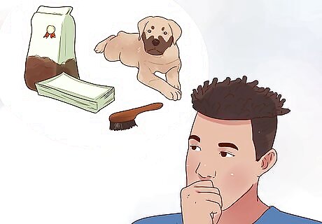 Create a budget for puppy-related expenses. Aside from the initial cost of purchasing the puppy, factor in how much you will need to spend on food, toys, cleaning and grooming supplies, and veterinary care. By creating a budget, you will have a more realistic expectation of the monthly costs associated with having a puppy at home. Depending on the breed and size, buying a puppy could cost between $100 and $150 per month in the first year. Do not forget to factor in costs of smaller items, such as collars, leashes, identification tags, and treats. Purchasing a puppy from a breeder will likely be more expensive than adopting a puppy from a shelter.