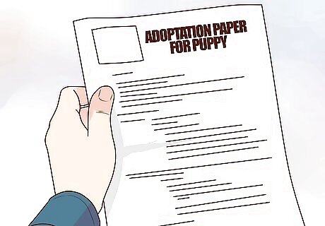 Learn about the adoption process. Be aware that you may not be able to adopt a puppy on the same day that you go to the animal shelter or rescue group. Commonly, there will be an interview process in which the staff will give you the full history and medical background of the puppy. There may also be a home visit where a member of the staff will visit your home to determine if your home environment is suitable for the puppy. Don’t be surprised if you are interviewed as well. The staff will need assurance that you will be a responsible pet owner and take good care of your puppy. In addition to the interview and potential home visit, you will need to fill out the necessary paperwork and pay the adoption fee (usually $100 to $200).