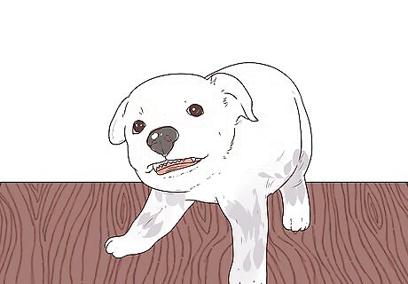 Physically exam the puppy. Puppies are ready to be adopted between eight and twelve weeks of age, at which time they are weaned from their mothers, able to eat solid food, and have received the first round of vaccinations. A puppy may look healthy at first glance but, upon closer inspection, may have some physical abnormalities. If you see signs that the puppy is not in good health, you may need to reconsider adopting the puppy. A good way to physically exam a puppy is start at the head and work your way to the tail. There are many aspects of a puppy’s physical appearance to examine. If you are not sure that you can do a thorough examination, consider asking the breeder or staff at the animal shelter or rescue group to guide you through the process. Examine the puppy’s head. For example, the nose should be cool and wet with no discharge. The gums should be a healthy pink color. Also, the eyes should look clear and bright and have a dark pupil. The ears should be clean and positioned according to specific breed characteristics. Put your hand on the puppy’s chest to feel the heartbeat. An abnormal heartbeat could indicate a genetic heart defect which could require veterinary care. Examine the puppy’s coat. If he is purebred, his coat should match the breed standard. In general, the puppy’s hair should be shiny and smooth without areas of hair loss. Look at the puppy’s legs. His legs should be straight without structural deformities (e.g., legs that bow in or out). You may want a breeder or veterinarian to do a more detailed orthopedic examination of the puppy.