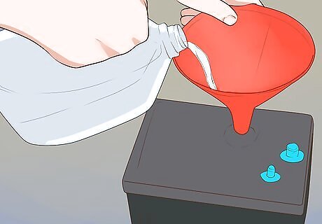 Add distilled water to your battery if necessary. If your battery does require occasional service, you may need to add water to it from time to time to keep it functioning properly. Batteries that are charged and depleted often or operating in high temperature areas will likely require service more often than those that are not. First, check the water levels in the battery, then add distilled water if it is required. Never service your battery without first putting on eye protection and gloves as the fluid inside is corrosive. Remember, many wet cell and all VRLA batteries do not require you to add water at any time. Always use distilled water when adding fluid to your battery.
