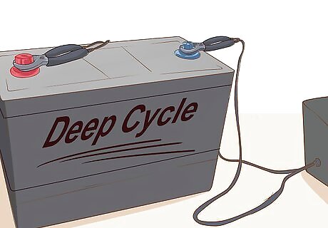 Choose a charging option. Deep cycle batteries are designed to tolerate being depleted and recharged often, but the way you choose to recharge your batteries may affect the type of battery you should choose. Many people charge their deep cycle batteries by plugging them into an outlet at their house or a campground, but others opt to use things like solar panels. Plugging your batteries into a power source is the fastest way to charge your batteries, but not all batteries tolerate being charged quickly as well. If you choose to plug your batteries in often to charge, you may want to use a wet cell or AGM battery, as they tolerate fast charging the best. Gel batteries will tolerate fast charging, but may not last as long. Trickle chargers can deliver slow charges that are not as harsh on the battery.
