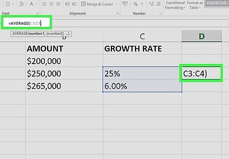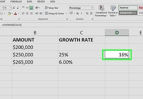 Create a formula using the AVERAGE function. The AVERAGE function tells you the mean average of a set of numbers. If we calculate the mean average of the growth rates we calculated in column C, we'll find the average growth rate of your investment. The column should look like this: =AVERAGE(C3:C20) (replace C20 with the address of the actual last cell containing a growth percentage in column C).