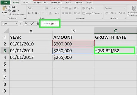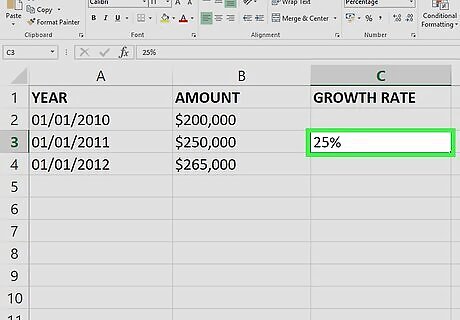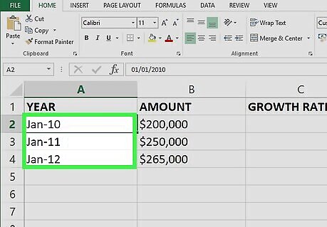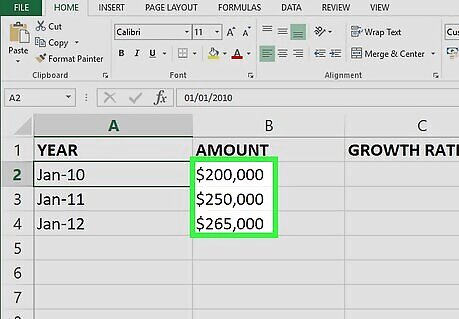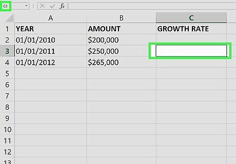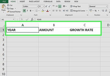 Label your columns. The first thing we'll need to is create column labels for our data. Type "Year" into A1 (the first cell in column A). Type "Amount" into B1. Type "Growth Rate" into C1.