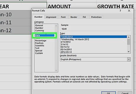Set the number formatting for the average growth rate calculator. To ensure your numbers display properly, you'll need to add numerical formatting to your cells: Click column A (the letter above the column) to select it, and then click the Format button on the Home tab. It'll be near the top-right corner of Excel. Then, click Format Cells on the menu, select Date in the left panel, and then choose a date format in the right panel. Click OK to save your changes. For column B, you'll want to format the amounts as currency. Click the "B" above column B to select it, click the Format button on the Home tab, and then click Format Cells on the menu. Click Currency in the left panel, select a currency symbol and format on the right, and then click OK. Column C should be formatted as percentages. Click the "C" above column C, and again, click Format, and then Format Cells. Select Percentage in the left panel, choose the number of decimal places in the right panel, and then click OK.
