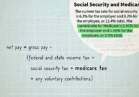 Deduct Medicare taxes. Like the Social Security tax, Medicare taxes are also a fixed percentage of a person’s earnings. In addition, employers are also responsible for paying Medicare taxes. Employees are currently taxed at 1.45% for Medicare.