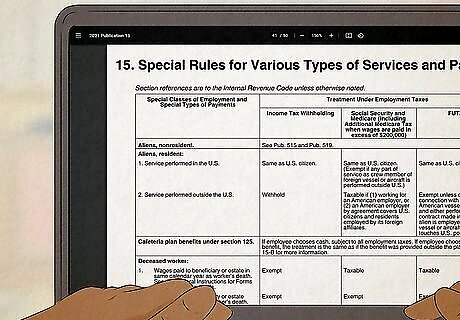 Apply federal and state income taxes. You'll use the tax tables that you've retrieved to apply the correct amount of federal and state income tax to withhold. For federal taxes, you'll look up the withholding amount based on the employee's gross pay, filing status, and the number of exemptions claimed. Then, you'll deduct that amount from the gross pay. For states taxes, consult your state's department of revenue website for instructions about how much to withhold.