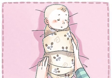 Swaddle your baby. Swaddling is a great way to calm your fussy baby; this is because your baby felt warm and comfortable in your womb and swaddling your baby can help mimic this safe feeling. To swaddle your baby, you should use a small and lightweight blanket, helping your baby stay tucked in so he/she doesn't disturb himself/herself by flailing his/her limbs around. To keep your baby safe from SIDS or from having trouble breathing, it's important to make sure that your baby isn't swaddled too tight and that he/she is placed on his/her back; you should also avoid swaddling your baby with a pacifier to avoid choking and making sure your baby can breathe. Here's how you should go about swaddling your baby: Lay out the blanket on a flat surface. Fold down one of the corners and place the baby's head over the fold. Wrap one side of the blanket around the baby, pinning his/her arm down. Take the point below your baby's feet and pull it up, tucking it into the top of the blanket point that was tightly wound around. Take the other side of the blanket and wrap it around your baby so his/her other arm is firmly tucked in.