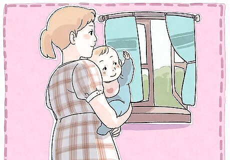Give your baby a change of scenery. Your baby may very well be fussy because he/she just wants a change of scenery. Changing your scenery, whether you move to a different room or add some exciting elements to the room you're in, can give your baby something else to pay attention to and can take his/her mind off of his/her agitation. If you don't have the energy for anything too elaborate, you can simply move to a different room or stand near the window and face the outdoors. Here are some other tricks you can try to mix things up for your baby: Look at your fish tank, a bright painting, or anything else exciting in your environment Turn on your overhead fan Dim the lights Move to your backyard or front porch Give your baby a new toy