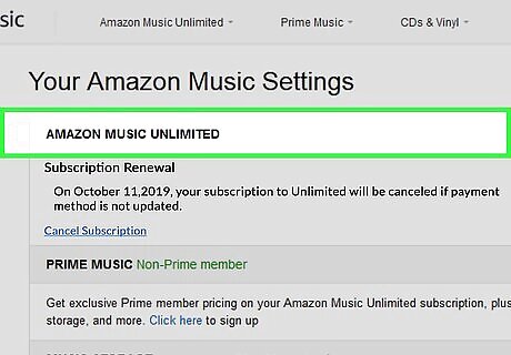 Expand the ″Amazon Music Unlimited″ section. If the section is collapsed, click the downward-pointing arrow next to ″Amazon Music Unlimited″ at the top-center part of the page.