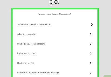 Click or tap a reason for closing your account. Based on your answer, you might have to select a follow-up answer. For example, if you choose "Digit's monthly cost," you'll need to choose another answer.