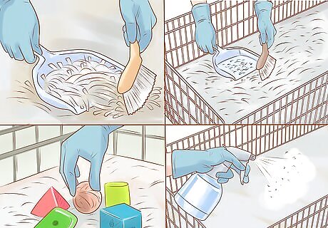 Clean your pet’s cage at least once a week. The larger the cage, the less often you’ll need to clean it. Remove all of the bedding, wipe down the box with a nontoxic soap or wipe, and replace the bedding. When you clean the cage, clean any toys or other items that are soiled. Be sure to spot clean every day, removing soiled bedding and replacing it with fresh bedding.