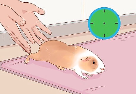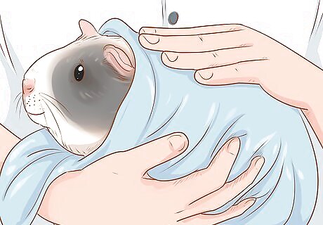 Swaddle your guinea pig in a towel. Cuddling your guinea pig will help you bond with your pet, but make sure to keep a towel below it to prevent bathroom accidents from getting on you. Guinea pigs have loose bladders, so they will most likely pee on you if you hold them for too long without a towel.