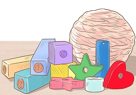 Add toys to your pet’s cage. A bored guinea pig is an unhappy guinea pig. Provide your pet with several different toys to keep it entertained. You should have a couple of toys in its cage and a few toys for floor time. Look for toys that are labeled as nontoxic plastic or untreated wood. Choosing hard toys that are made for small animals, birds, or babies will help keep your pet safe. Cardboard boxes are also a great option for making your toys. Keep two sets of toys so that you can rotate them out when your pet gets bored.