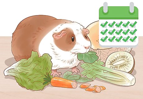 Supply your pet with fresh fruits and vegetables daily. Choose a vitamin C-rich fruit or vegetable because guinea pigs can’t make their vitamin C. They can develop scurvy if they don’t get enough through their diet. Good options include leafy greens, colorful sweet peppers, zucchini, carrots, strawberries, oranges, apples, and guava.