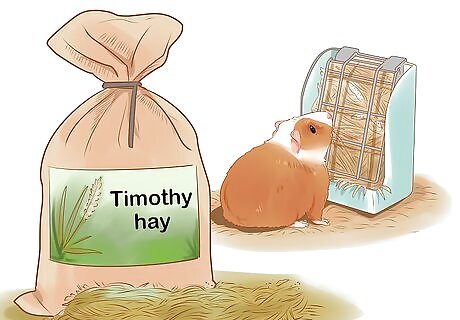 Stock the cage with an unlimited amount of Timothy hay. Guinea pigs need the fiber and minerals in Timothy hay as part of their diet, and the constant availability of the hay allows them to grind down their teeth through chewing, which they need since their teeth keep growing. Try using Timothy hay as part of your bedding. Place the hay in an empty toilet paper or paper towel roll so that your pet can chew and shred the cardboard as it snacks. Feed pregnant or nursing guinea pigs alfalfa hay, which is more nutritious but too rich for the average guinea pig.