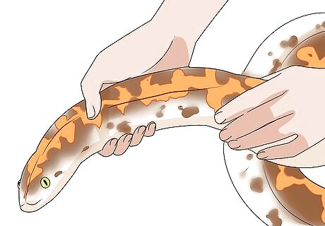 Handle the snake gently. Use 2 hands to pick your snake up by its middle. Don't try to lift it by the front third of its body--it might think you are food. These snakes do well with lots of attention and handling, so you can interact with your snake several days a week if you want to. Sand boas love to burrow, so don't be alarmed if it tries to sneak up your sleeve. These snakes are typically pretty docile. If they do bite you, don't worry. It won't hurt and is not dangerous. Just holding the snake is the best interaction you can have with it. Enjoy it!