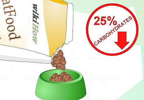 Limit the amount of carbohydrates in your cat’s diet. Carbohydrates are not a necessary part of carnivore’s diet. Not only are cats not able to digest carbohydrates as well as dogs and people, but the excess carbohydrates get stored as fat. Dry cat foods are typically high in carbohydrates. After a carbohydrate-rich meal, your cat’s blood glucose level stays high, which can put her at risk for developing diabetes. Your cat’s diet should be no more than about 25% carbohydrates, but your cat would probably be fine with an even smaller percentage. Soft, meat-based foods are lower in carbohydrates than dry foods.